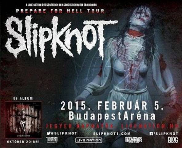 Büszkén jelentjük, hogy a többszörös platinalemezes és Grammy-díj nyertes maszkos bestiák, a SLIPKNOT tagjai végre készen állnak a régóta várt visszatérésre, amelynek Budapest is része lesz 2015. február 5-én csütörtökön a Prepare For Hell turnéjuk keretében ? tudatta Márkus Éva Marketing & PR Director.