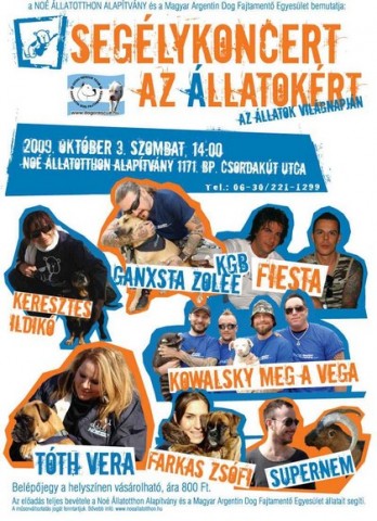 A koncert szombat délután 14 órakor kezdődik az Állatotthon területén, a XVII. kerületi Csordakút utcában. Belépőjegy a helyszínen vásárolható 12 órától 800 forintért. 12 éves kor alatt a belépés ingyenes. Az előadás teljes bevétele a NOÉ Állatotthon Alapítvány és a Magyar Argentin Dog Fajtamentő Egyesület állatait segíti. A műsorváltozás jogát fenntartják. Szeretettel várnak minden állatbarátot és rajongót!