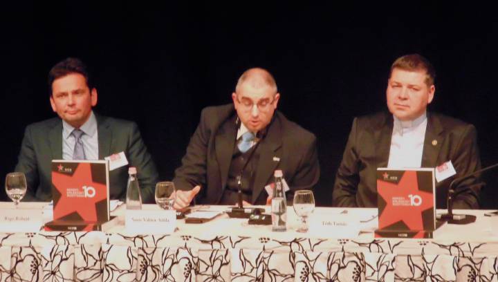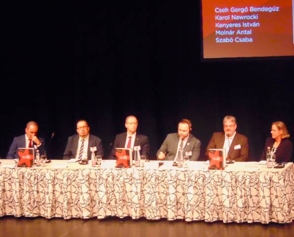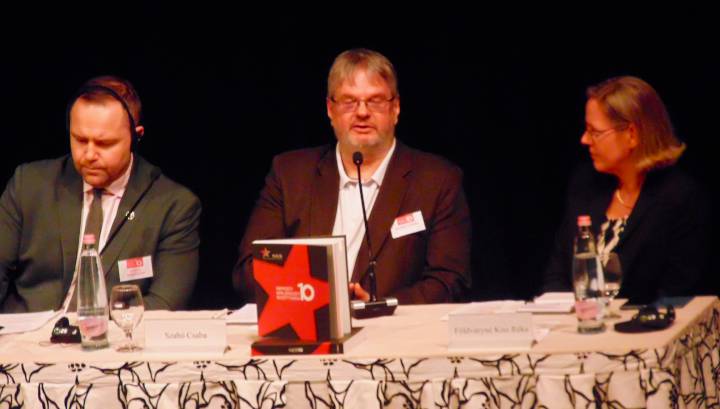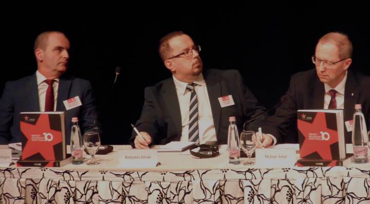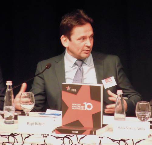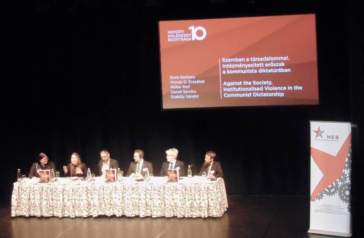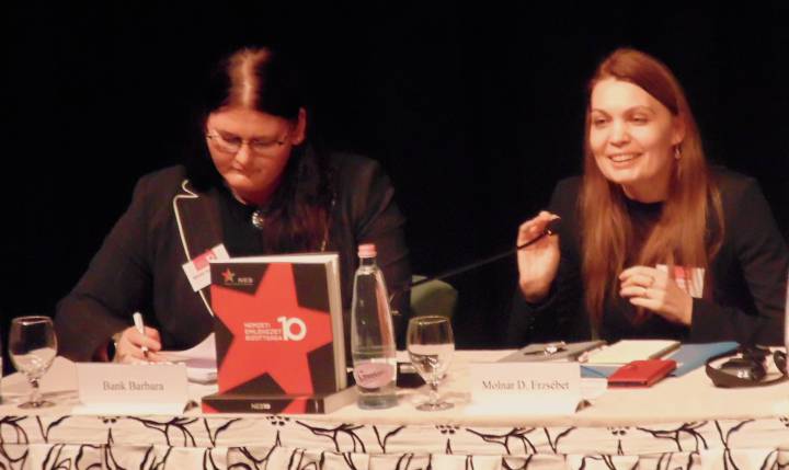 Az egyórás földszinti ebédet további három 50-50 perces panelbeszélgetés követte A közelmúlt feltárásának lehetőségei és korlátai. Források és kutatási feltételek, továbbá Történelem és emlékezet. Az oktatás és az ismeretterjesztés feladatai, illetve a félórás kávészünet után Szemben a társadalommal. Intézményesített erőszak a kommunista diktatúrában címekkel a 17 órai zárásig. Már érkezéskor a regisztrációnál mindannyian megkaptuk a NEB10 című 320 oldalas jubileumi képes kiadványt. Köszönjük szépen!