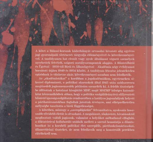 A kötet a Rákosi-korszak káderhiányát orvosolni hivatott alig egyéves jogi gyorstalpaló történetét tárgyalja előzményeivel és következményeivel. A tanfolyamra hat elemit vagy nyolc általánost végzett személyek nyerhettek felvételt, szigorú osztályszempontok alapján. A Büntetőbírói és Ügyészi – 1950-től Bírói és Államügyészi – Akadémia négy évfolyamot bocsátott útjára 1949 és 1954 között. A tanfolyam létezése jelentéktelen epizódnak is tűnhetne akár, következményei azonban nem feledhetők.
