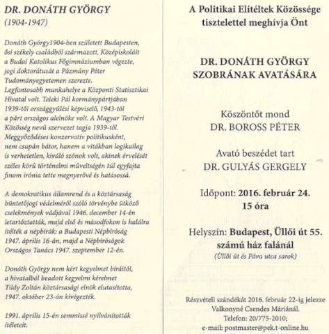 A kommunizmus áldozatainak emléknapja alkalmából a Szabadságharcosok Közalapítvány és a Magyar Politikai Elítéltek Közössége avatta volna fel ma 15 órakor Donáth György egykori országgyűlési képviselő szobrát egykori lakóhelye, az Üllői út 55. számú sarokház falán. Az ünnepségen több tucatnyi tiltakozó jelent meg, akik nem kérünk a fajgyűlöletből, a rasszista ünneplő maga is rasszista feliratú táblákat feltartva, folyamatos fütyüléssel és kiabálásokkal fejezték ki, hogy ellenzik a szoborállítást. Gulyás Gergely, az Országgyűlés törvényalkotási bizottságának elnöke, a Fidesz alelnöke és Boross Péter volt kormányfő végül a beszédük elmondása nélkül távoztak.