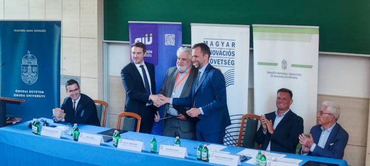 A Magyar Innovációs Szövetség délután választmányi ülést tartott tagintézménye, az Óbudai Egyetem Bécsi úti Campusán. Az ülés rendhagyó és unikális napirendi pontja egy hosszú távú, háromoldalú stratégiai együttműködési megállapodás aláírása volt, melyet Bódis László, a KIM helyettes államtitkára, a NIÜ vezérigazgatója; dr. Szabó Gábor, a MISZ elnöke és Kiss Ádám István, az NKFIH elnöke írtak alá ünnepélyes keretek között.
