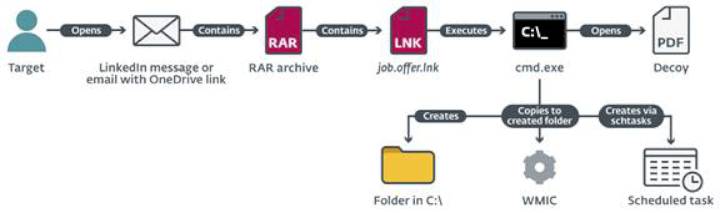 Jean-Ian Boutin, az ESET fenyegetéskutatási vezetője szerint két módszert is alkalmaztak. A kártevő fájlokat vagy közvetlenül a LinkedIn levelezőjén keresztül vagy egy OneDrive linket tartalmazó e-mailben küldték el. A másik módszerre gondosan felkészültek a hackerek, hiszen a LinkedIn profiljukkal azonos e-mailfiókot is létrehoztak a látszat kedvéért. – Az üzenet egy nagyon hiteles állásajánlatról szólt, látszólag egy releváns szektor jól ismert vállalatától érkezett a megkeresés – mondta Dominik Breitenbacher, a kutatás vezetője.