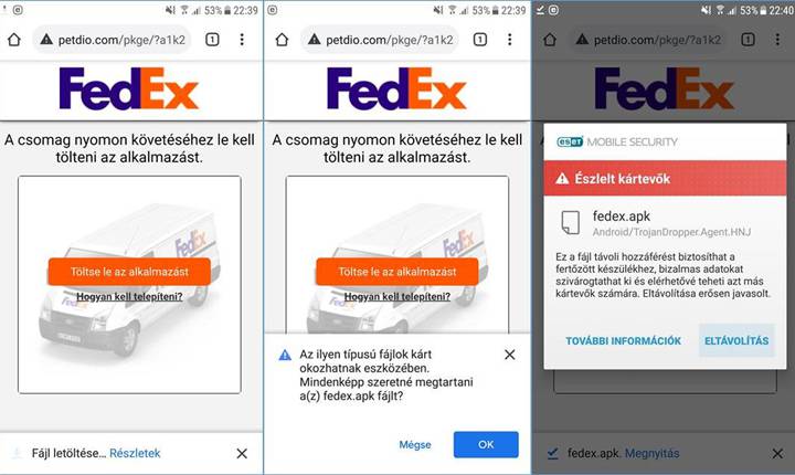 A csomagunk nyomkövetésére felszólító SMS minden esetben tartalmaz egy linket, amelyet megnyitva látszólag egy ismert futárszolgálat oldalára kerülünk. Itt arra kérnek minket, hogy a csomagunk nyomon követeséhez töltsünk le és telepítsünk egy alkalmazást. Ha így teszünk, egy .apk kiterjesztésű fájl töltődik le a telefonunkra, amely kártevőt tartalmaz. Fontos megjegyezni, hogy ez a vírus csak akkor jelent veszélyt, ha a telefonunkon ki van kapcsolva az ismeretlen forrásokból történő telepítés tiltása. Ha ez be van kapcsolva, akkor jelezni fog, hogy nem megbízható a telepítő, és külön engedélyt kell adnunk ahhoz, hogy települhessen a készülékre – természetesen ezt ne adjuk meg neki.