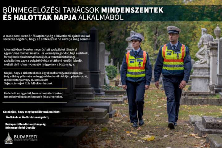 A BRFK állandó rendőri jelenléttel biztosítja a fővárosi temetőket és környéküket. Bár ezekben a napokban elhunyt szeretteinkre emlékezünk, nem feledkezhetünk meg saját biztonságunkról sem! – javasolják.