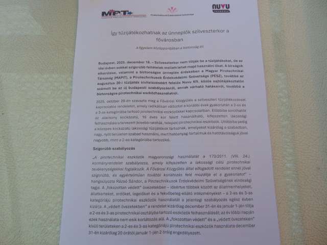 Szilveszterkor nem tiltják be a tűzijátékokat, de az idei évben sokkal szigorúbb feltételek mellett lehet majd használni őket. A bírságok elkerülése, valamint a biztonságos ünneplés érdekében a Magyar Pirotechnikai Társaság (MAPIT), a Pirotechnikusok Érdekvédelmi Szövetsége (PÉSZ), továbbá az augusztus 20-ai tűzijáték kivitelezéséért felelős Nuvu Kft. közös sajtótájékoztatón számolt be az új budapesti szabályozásról, annak várható hatásairól, továbbá a biztonságos pirotechnikai eszközhasználatról.