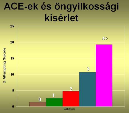 a 6 vagy több negatív gyermekkori élményt átélők körében több mint 4-szer nagyobb az esélye, hogy valaki egyszer öngyilkosságot kíséreljen meg, mint az 1-3 ACE-szel rendelkezők körében. A többszöri öngyilkossági kísérletnek ezzel szemben 27,5-szeres esélye van a legtöbb negatív gyermekkori élményt átélők csoportjában, mint az 1-3 negatív gyermekkori élményt átélők között.