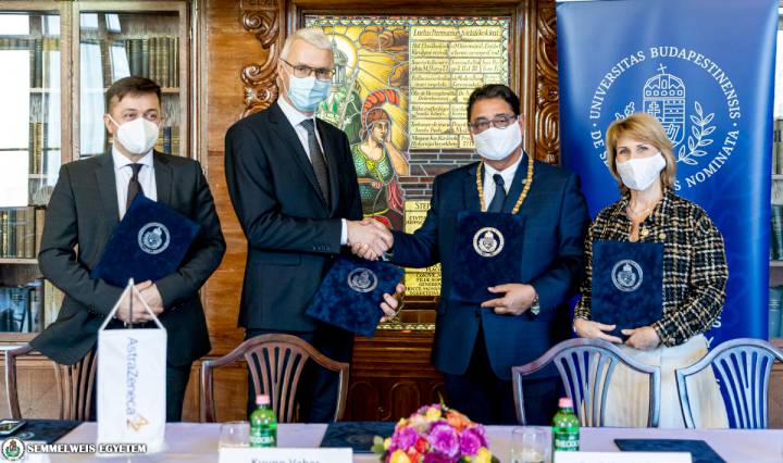 Az együttműködési megállapodást dr. Merkely Béla, a Semmelweis Egyetem rektora, dr. Pavlik Lívia kancellár, Kuuno Vaher, az AstraZeneca Közép-Európai Cluster igazgatója és dr. Faluvégi Mátyás, az AstraZeneca magyar kutatási részlegének igazgatója írta ma alá a Semmelweis Egyetemen a közös klinikai kutatások növelésének érdekében.