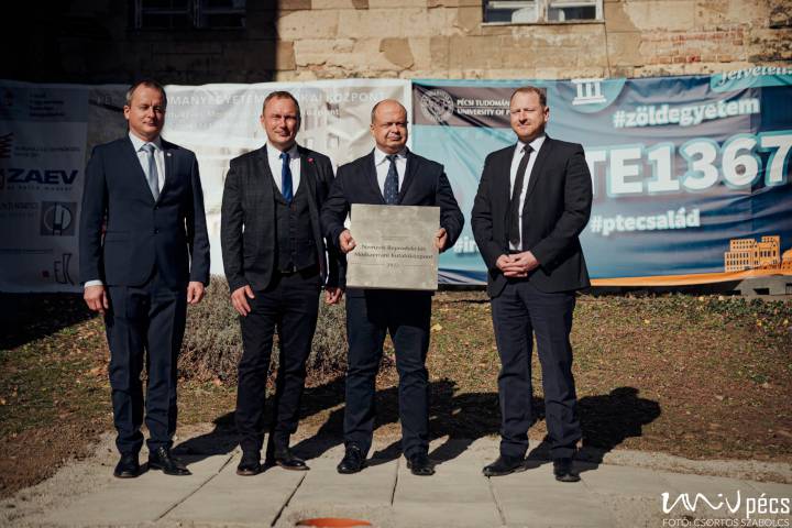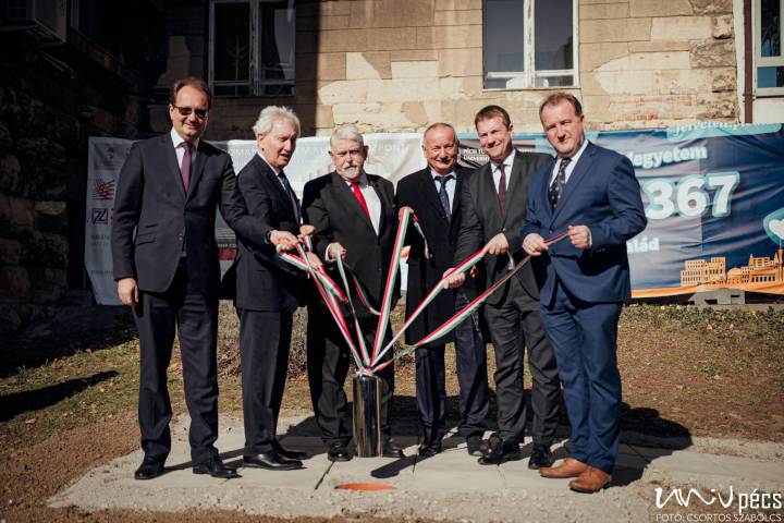 A leendő épület ünnepélyes alapkőletételén ma délelőtt köszöntőt mondott Kásler Miklós, az emberi erőforrások minisztere, Bódis József felsőoktatásért, innovációért és szakképzésért felelős államtitkár, a projekt szakmai vezetője, Juhász Roland állami vagyongazdálkodásért felelős államtitkár, Hoppál Péter országgyűlési képviselő, Kővári János, Baranya megye fenntartható városfejlesztésért felelős biztosa és Miseta Attila, a PTE rektora.