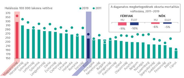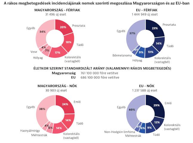 A daganatos megbetegedések becsült előfordulási gyakorisága, és a kapcsolódó halálozás Magyarországon 2019-2020-ban meghaladta az uniós átlagokat. A 100.000 főre eső 328 halálesettel 2019-ben Magyarországon volt a legmagasabb a daganatos betegségekkel összefüggő halálozás egész Európán belül, mintegy 33 százalékkal haladtuk meg az uniós átlagot.