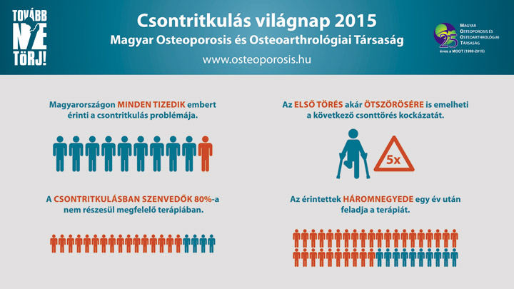 A Magyar Osteoporosis és Osteoarthrológiai Társaság (MOOT) kezdeményezésére olyan országos osteoporosis centrum hálózat jött létre, amely több szakterület összefogásával biztosítja több százezer beteg legmagasabb szintű ellátását. Ennek köszönhetően az elmúlt hét évben közel felére (88 ezerről 48 ezerre) csökkent a csontritkulás miatt bekövetkezett törések száma Magyarországon. Ilyen jelentős mértékű csökkenést más országban még nem regisztráltak, a társadalom elöregedésével azonban a pozitív fejlemények ellenére is egyre fenyegetőbb probléma a csontritkulás. ? Miközben a várható élettartam nő, tehát az osteoporosis potenciálisan még több embert érint, a kezelt betegek aránya tíz év alatt 150 ezerről százezerre csökkent. A már törést szenvedett betegek csupán kevesebb, mint 20%-át kezeljük, pedig a csontritkulás miatt bekövetkezett törés megduplázza, sőt, akár ötszörösére is emelheti a következő csonttörés kockázatát ? fejtette ki Dr. Szekeres László, a MOOT elnöke.