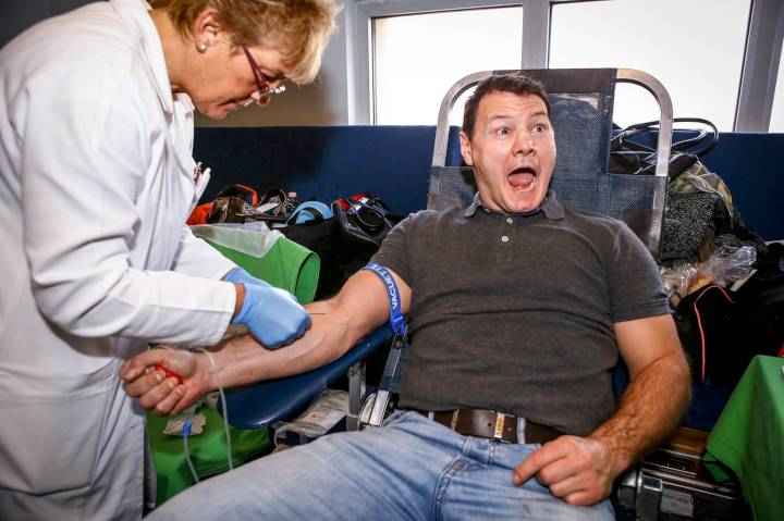 A színészgárdából Dolhai Attila számít a legrutinosabb véradónak ? nyugodtan társalgott a tőle vért vevő doktornővel és a mellette fekvő kollégákkal. ? Édesapám rendszeres véradó volt, amiért csodáltam őt gyerekként ? az ő mintáját követve körülbelül húsz éve adtam én is először. Egyáltalán nem kell félni egyébként a véradástól, az előkészületekkel együtt maximum húsz perc alatt lezajlik, maga a szúrás pedig annyira sem fáj, mint egy szúnyogcsípés ? árulta el a művész, aki nagyon szeret korcsolyázni, ezért véradás után a Jégterasz jegét Mészáros Árpád Zsolttal együtt próbálta ki.