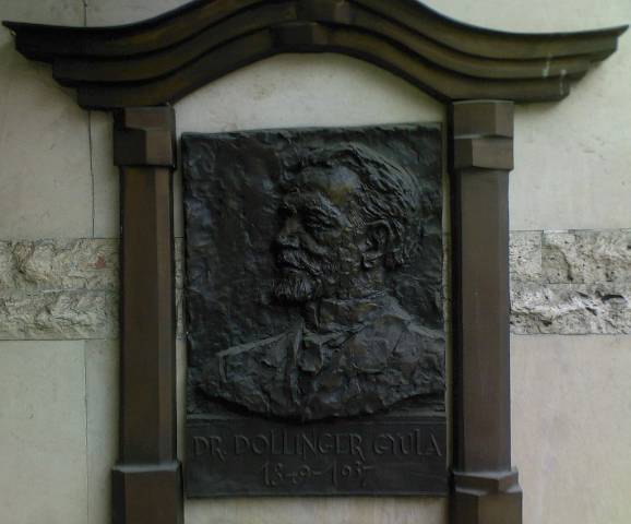 Dr. Dollinger Gyula (1849. április 10. ? 1937. március 2.) 1875-ben Pesten orvos- és sebészdoktori, majd 1877-ben ugyanitt szülészmesteri oklevelet szerzett. Közben már 1874 júniusától tanársegéd a kórszövettani tanszéken, majd 1876-77-ben műtőnövendék Kovács József professzor sebészeti klinikáján. 1882-ben külföldi tanulmányútra indult német, francia és angol sebészeti és ortopédiai intézetekbe. Ugyanezen évben Budapesten a testegyenészet (ortopédia) tárgykörében magántanári képesítést szerzett. 1889 áprilisától az Irgalmasrend budai kórházának műtője, 1891-től ugyanitt a sebészeti osztály kinevezett műtőorvosa. 1891-től rendkívüli, 1897-től nyilvános rendes tanár a budapesti Orvoskaron, egészen 1919-es nyugdíjba vonulásáig. Az ortopédia hazai megalapozója, külföldön is elismert szaktekintély volt.