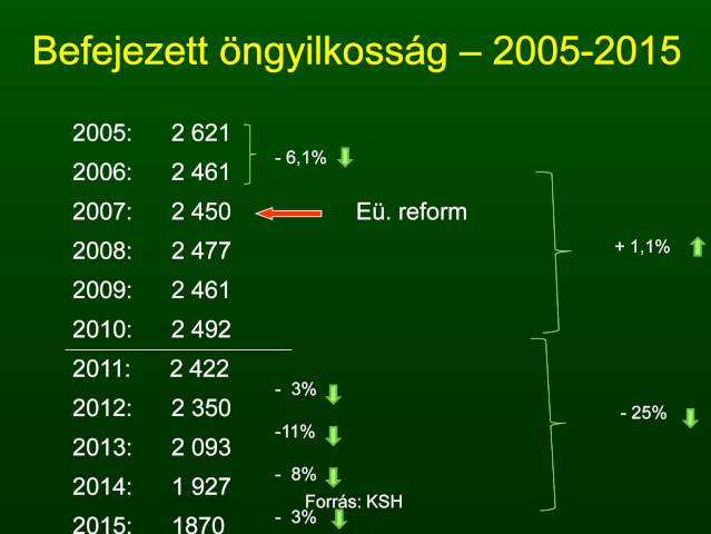 Összehasonlításként 2006 és 2010 között ? köszönhetően az akkor egészségügyi átalakításoknak ? stagnált, illetve minimálisan még emelkedett is a befejezett öngyilkosságok száma. A 2007-es átalakítás mind a járó-, mind a fekvőbeteg pszichiátriai ellátórendszert jelentősen meggyengítette, öt év kellett ahhoz, hogy a szakma rendezze sorait, aminek eredményei később megjelenhettek már a számokban is. Újra nőtt a gondozókban és az osztályokon az orvosok és a pszichológusok száma, felújítottak számos vidéki pszichiátriai osztályt. A csökkenés köszönhető annak is, hogy a magyar pszichiátriában és lelki egészség ellátásban vannak nemzetközi szintű jó gyakorlatok, amikre lehetne építeni.