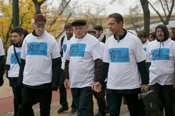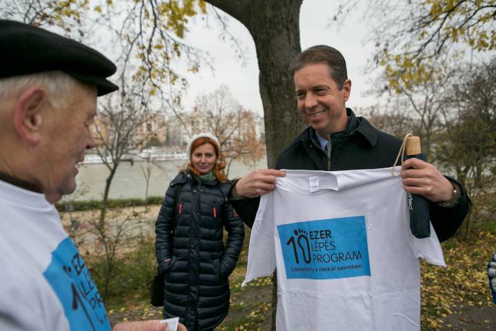 Több mint húszezer férfi él Magyarországon, aki szembesült már prosztatarákkal, s évente 4500 új betegről tudni: sokan élhetnének közülük kevesebb panasszal, ha eljutnának gyógytornászhoz és rendszeresen mozognának. Fotóinkon a prosztatarákos férfiakat mozgásra ösztönző 10 Ezer Lépés Program pólóját veszi fel egy gyaloglásra érkező résztvevő a Margitszigeten; Kalotay Gábor, a Gyógyulj Velünk Egyesület (GYVE) prosztatarákon keresztülment elnöke adja át a pólót prof. dr. Nyirády Péternek, a Semmelweis Egyetem Urológiai Klinika igazgatójának; Kalotay Gábor elnök és prof. dr. Nyirády Péter klinikaigazgató a prosztatarákos férfiakat mozgásra ösztönző gyaloglók élén a Margitszigeten.
