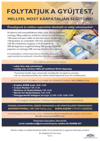 Az eddigiekben megismert gyűjtőpontok változatlanok, az Eszterházy Károly Katolikus Egyetem épületeiben és a Gyakorlóiskolában is várjuk az adományokat, egészen április 18-ig, azaz Húsvét hétfőig. Az egyetem segítő akciója a továbbiakban becsatlakozik a Katolikus Karitász országos hálózatába: a Kárpátalja területére érkező, háború elől menekülő embertársaink étkeztetéshez szükséges főzési alapanyagokat gyűjtünk, a szállítmányt a Karitász juttatja el a határon túli területre.