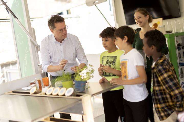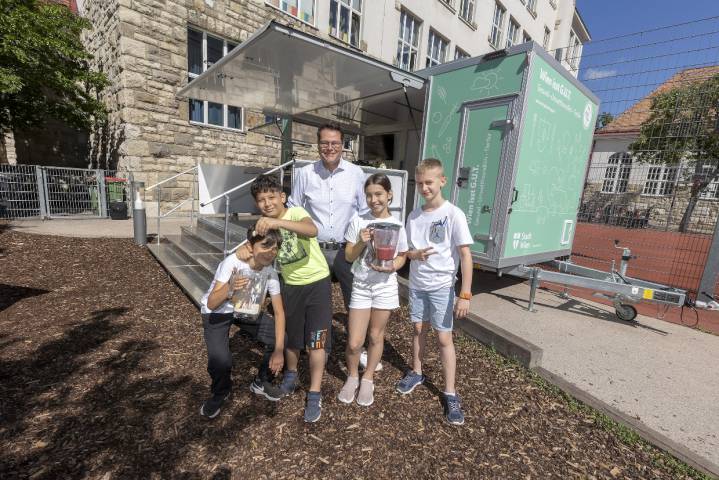 Bécsi foodtrailer járja az iskolákat. Aki bécsi szeleten és császármorzsán nőtt fel, és a menzás finomfőzelékről sincsenek túl jó emlékei, annak igencsak nehéz felnőtt korban egy egészségesebb és fenntarthatóbb irányba változtatnia – tudatták sajtósaik. PID/Bubu Dujmic fényképein Jürgen Czernohorszky klímavédelmi tanácsnok látható a foodtrailer első vendégeivel.