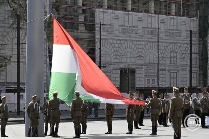 Ma 09 órakor ünnepélyes keretek között, katonai tiszteletadás mellett felvonták, majd félárbócra engedték Magyarország nemzeti lobogóját az Országház előtti Kossuth téren, melyre Szalay-Bobrovniczky Kristóf honvédelmi miniszter adott engedélyt. A zenekar eljátszotta a Himnuszt, majd a Szózatot. Fotónk MTI/Lakatos Péter felvétele.
