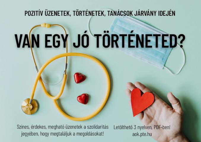 Van egy jó történeted? címmel közösségi alkotás született a pécsi orvoskaron. Három nyelven, magyarul, angolul és németül is megjelent a Pécsi Tudományegyetem Általános Orvostudományi Kar honlapján a Van egy jó történeted? című kiadvány, ami a kar hallgatóinak, oktatóinak és munkatársainak 45 pozitív hangú üzenetét tartalmazza.