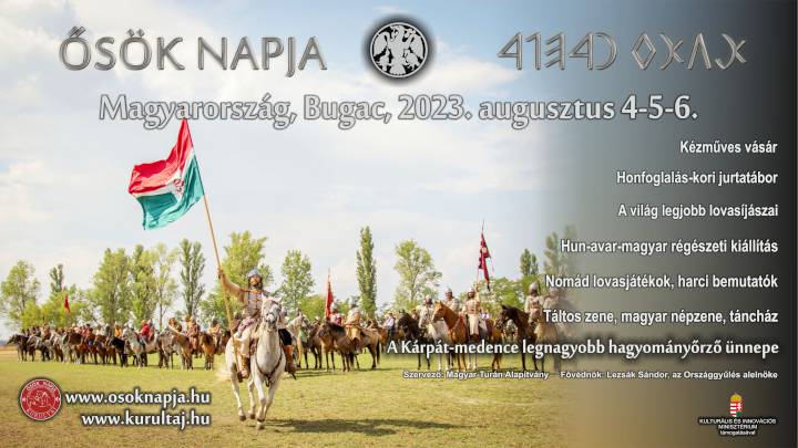 A kiosztott sajtóanyag szerint hatalmas jurtatáborral vár több tízezer látogatót augusztus 4-e és 6-a között az Ősök Napja hagyományőrző rendezvény Bugacon. A Kárpát-medencei magyarság legnagyobb hagyományőrző ünnepét az idén hetedik alkalommal rendezik meg – olvasható a szervezők közleményében. Az Ősök Napja, amely a Kurultaj testvérrendezvénye, nomád vonulással, harci bemutatókkal, lovas versenyekkel és vetélkedőkkel, íjászprogramokkal, hagyományőrző sportviadalokkal, a magyar-hun-avar örökséget bemutató szakmai kiállításokkal, valamint népzenei és magyar táltos-zenei programokkal várja az érdeklődőket.