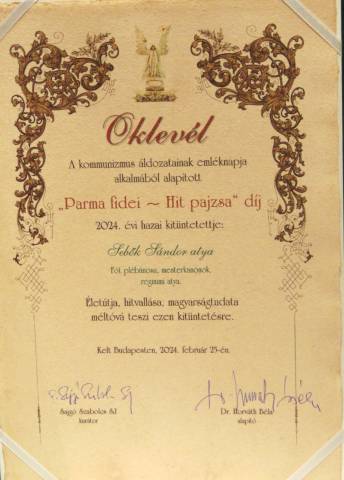A Parma fidei – Hit pajzsa-díjat 2002-ben alapította Horváth Béla volt MDF-es és kisgazda politikus, korábbi országgyűlési képviselő és a 2008-ban elhunyt Gyurkovics Tibor író. Olyan papoknak, szerzeteseknek ítélik oda minden évben, akik a kommunista diktatúra alatt is hűségesek maradtak hitükhöz. Az elismeréssel járó díjat idén Miletics Katalin Janka éremművész, bencés obláta készítette. Az ünnepelt plébános emellett a Parma fidei – Hit pajzsa-díj Alapítványtól egy, a Nógrád vármegyei Erdőkürtön élő pálos apácák készítette új miseruhát is kapott. A díjat olyan papoknak, szerzeteseknek ítélik minden évben oda, akik a kommunista diktatúra alatt is hűségesek maradtak hitükhöz.