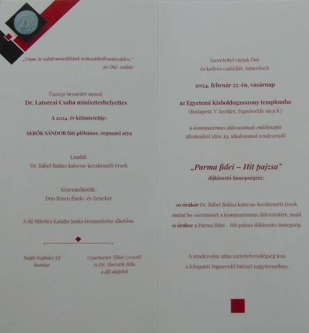 Latorcai Csaba, a KTM parlamenti államtitkára, a díjazottat méltatva elmondta: Sebők Sándor, aki 1977-ben lett regnumi atya, sugározza Isten szeretetét a rábízottakra ott, ahová hivatása éppen szólítja. Az apostoli szeretet vezette a regnumosokat a bolsevik diktatúra idején is, miközben meg kellett élniük a Regnum Ház bezáratását, és a Regnum Marianum templom felrobbantását. – A szeretet tartotta meg és vezette azokat a regnumos atyákat és társaikat, akiket a bosszúszomjas kommunista hatalom hamis vádakkal háromszor is bíróság elé citált, hogy aztán nehéz börtönévekkel büntesse meg bátor hitvallásukat, példát statuálva az őket követőknek és a mellettük kitartóknak – hangoztatta az államtitkár.