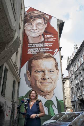 Egy erzsébetvárosi lakóház tűzfalára Karikó Katalin és Krausz Ferenc Nobel-díjas tudósok óriásportréja került fel, a műalkotáson olvasható, hogy Magyarként, a tudomány élvonalában, az emberiséget szolgálva, ahogy a szóvivő asszony az avatáson idézte. Vitályos Eszter megjegyezte: ez a gondolat tökéletesen jellemzi mindkét tudós pályafutását, munkásságát. Emlékeztetett arra, hogy a két Nobel-díjas magyar tudós sorsában közös, hogy kistelepülésről indultak, Magyarországon tanultak, magyarul gondolkoznak és büszkék a magyarságukra.