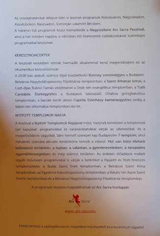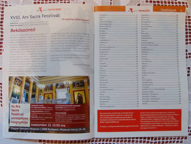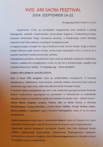 Miskolc szeptember 13-ától 2. alkalommal szervez önálló, nagyszabásúbb városi fesztivált az Ars Sacra égisze alatt. Az Éltető Lélek Alapítvány összefogásával – az egyházakon, felekezeteken túl – civil szervezetek, helyi művészek, intézmények, iskolák csatlakoztak a kezdeményezéshez: Kilenc nap, 45 program. Flach Antal művésztanár olvasta fel a polgármester levelét, aki az isteni békét és a krisztusi szeretetet sugárzó Ars Sacrát úgy jellemezte, hogy az ma már nem egyszerűen fesztivál, hanem misszió. Az MMA-ösztöndíjas zenei szakíró szervezőnek a napokban jelenik meg nagyszabású, kétkötetes dokumentumgyűjteménye, a Miskolci dalok, dallamok. Míg Flach Antal az Ars Sacra zenei programjait, többek között az operaénekes Szegedi Csaba és Pitti Katalin fellépését, valamint Mosonyi Mihály, Bach és Olivier Messiaen műveinek előadását emelte ki a kínálatból, addig Máger Ágnes festőművész, Miskolc díszpolgára az irodalmi programokról, kiállításokról, a városi és környékbeli zarándoklatokról, spirituális indíttatású csoportos kirándulási lehetőségekről szólt.