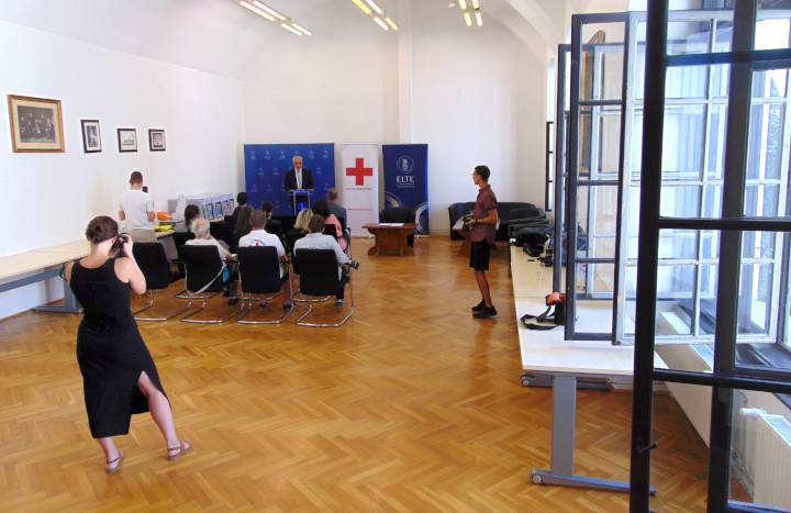 Az adományok ünnepélyes átadása ma 13 órakor kezdődött az ELTE Kancellária Tanári Klubban, a belvárosi Szerb utca 21-23. II. emeletén. Köszöntőt mondott dr. Darázs Lénárd, az ELTE általános rektorhelyettese és Horváth Péter Zsolt, a Magyar Vöröskereszt főigazgató-helyettese. Fotóink Egressy Rita felvételei.