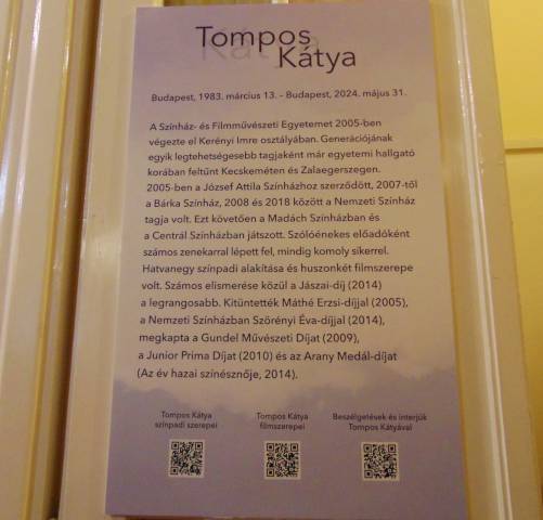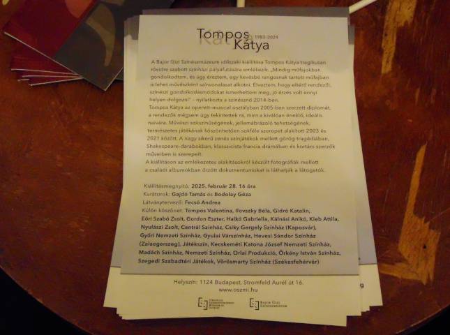 Tompos Kátya (1983. 03. 13 – 2024. 05. 31.) emlékére nyílt kiállítás ma 16 órakor a Budai Bajor Gizi Színészmúzeumban, mely a tavaly 41 évesen elhunyt színésznő tragikusan rövidre szabott színházi pályafutását idézi fel. A tárlat szeptember 28-ig, szerdától vasárnapig látogatható.