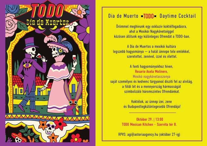 Exkluzív koktélfogadás lesz október 29-én szerdán 13 órakor a TODO Mexican Kitchen étteremben, ahol Mexikó nagykövetasszonya társaságában állítjuk fel a Día de Muertos (a mexikói halottak napja) ünnepi ofrendáját – tudatta Molnár Ágnes.
