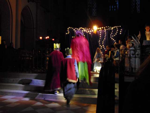 Az Örökimádás templomban a mai 16 órai pásztorjátékban kísérhettük végig a kis Jézus megszületését. Mint minden évben, most is megtelt az Üllői úti templom. Csak a szentély volt megvilágítva, a sötét padsorokból Egressy Rita fényképezett.