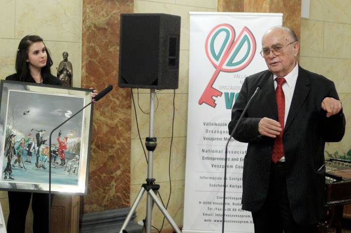 Gazsi Attila, a VOSZ Veszprém Megyei Szervezetének elnöke az est házigazdájaként kiemelte, hogy a díj a magyar tudás és tehetség világformáló erejét hirdeti. A személyesen jelenlévő Demján Sándornak megköszönte az a rendkívül nagyvonalú támogatást, amellyel az elmúlt évtizedekben a magyar tudományt, művészetet és kultúrát segítette. A Prima Díj szerepét a vállalkozói szféra társadalmi felelősségvállalásának példamutató, értékteremtő, jószolgálati megnyilvánulásaként értékelte ? tudtuk meg Holub Katitól. Fotóink Orosz Péter felvételei.