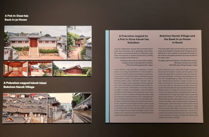 Hasonlóan izgalmas terepe a kiállításnak a hánok, a hagyományos koreai technikával és stílusban készült épület, amelyet a természettel és a környezettel harmóniában alkottak. Előnyei miatt ma is használják Koreában, jóllehet a házak helyett már a modern épületek lakásai jelentik a lakóhelyek leggyakoribb formáját. A kiállításban az épületek szerkezeti érdekességein túl érzékelhetővé válik a férfi és a női terek közötti különbség.