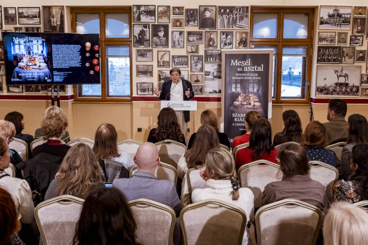 A Mesél az asztal című kiállítás a jeles napok szokásrendjét követő népi gasztronómiai hagyományokra épül. A családot összekovácsoló apróságok, gesztusok és természetesen az ételek is biztonságot és kiszámíthatóságot teremtettek még a legbizonytalanabb időkben is. Az egész éves kerti munka, a gondosan felhizlalt jószág, az összegyűjtögetett tojás, a saját kezűleg hímzett terítő mind-mind értelmet nyert és célt ért, hiszen mindezek által és mindezekkel együtt volt egykor méltó és teljes az ünnep, melyet érdemes ma is felidéznünk. Az adventtől vízkeresztig tartó időszak ételei és tradíciói Borbás Marcsi válogatásában láthatók a kiállított fotókon, tolmácsolásában megismerhetjük az étkezéshez kapcsolódó hiedelmek, rituálék jelentőségét.