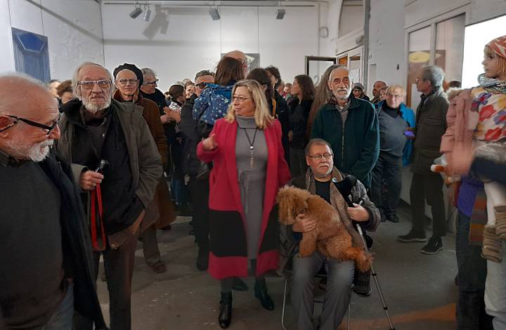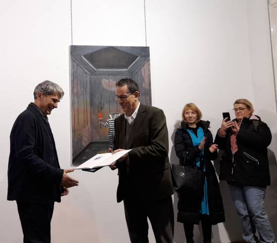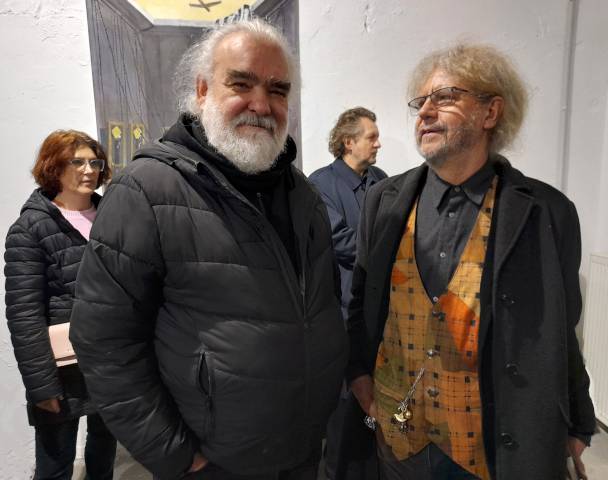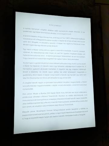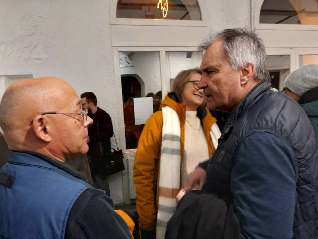 Ferenczy Győző ügyvezető elnöki bevezetője után Forgács Péter médiaművész mobiltelefonján játszotta le a laudációt, majd egy történetet is elmesélt a nagyszámú közönségnek. Sajnos nem koccinthattunk az ünnepelttel, mert az egyik újságírónő interjúra kérte A Bolond Teremőr emlékműve elé. Mire hosszú beszélgetésük véget ért, a sok-sok finom fehér és vörösbort is megittuk. KB-fotóink Katona Lucia, ER-fotóink Egressy Rita felvételei.