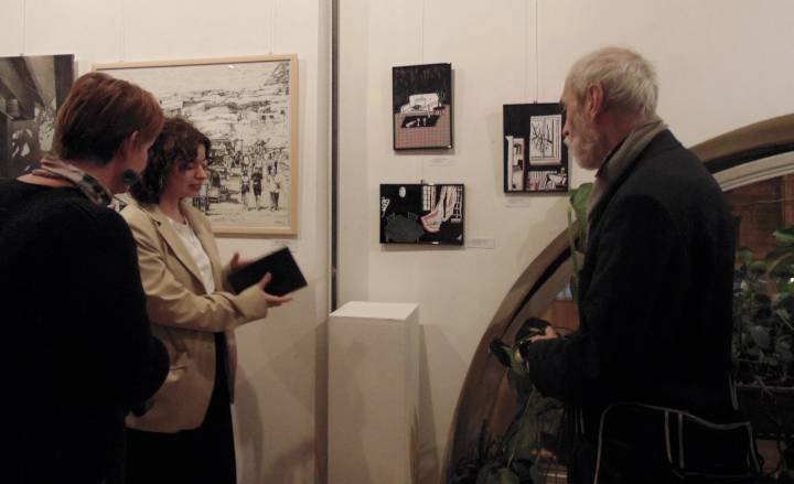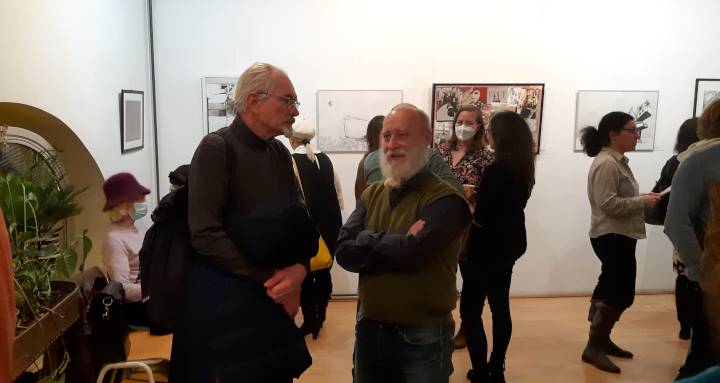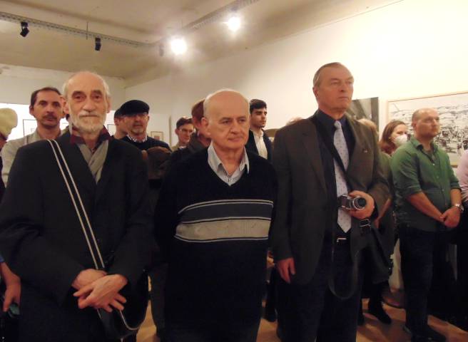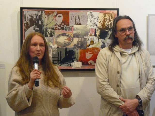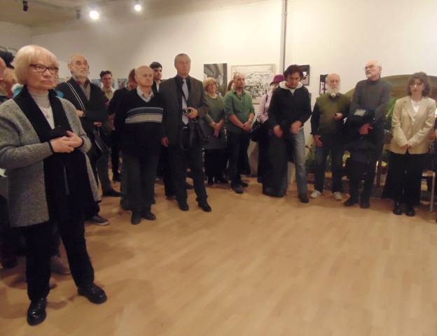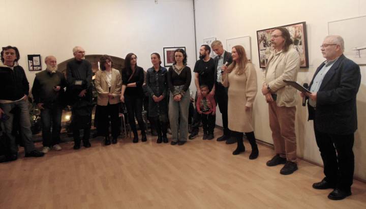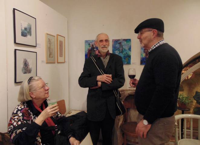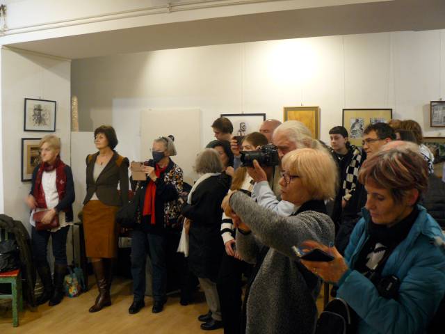 A kiállítást az egyik kiállító: Orbán György János gyomai születésű 71 éves képzőművész, a salgótarjáni Balassi Bálint Asztaltársaság elnöke nyitotta meg. Elhozta az Asztaltársasági Füzetek legújabb számát is, melynek címlapját saját grafikája díszíti, s megírja benne No, pupu! című 1975-ös orosházi sorhatárőrélményét. Egyenként beszélt az alkotásokról és a jelenlévő alkotókról, de egyikükre sem mutatott rá közben, így nem derült ki, hogy a nagyszámú résztvevőből ki a kiállító és ki az érdeklődő. Az összejövetelt szolid borozással, sütizéssel, pogizással zártuk. B1-fotóink Egressy Rita, P1-fotóink Nagy László felvételei.