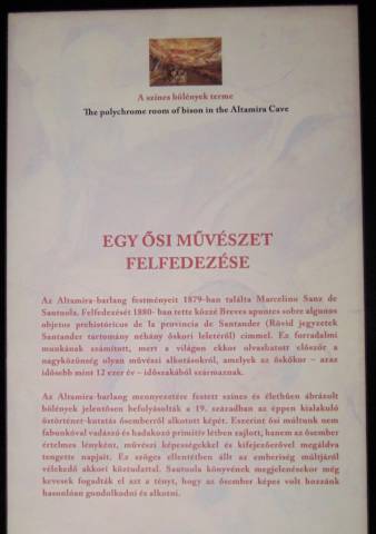 Dr. Hammerstein Judit, az MNM megbízott főigazgatónője felidézte: Marcelino Sanz de Sautuola üzletember és földbirtokos, amatőr kutató a kislányával, Mariával fedezte fel az Altamira-barlang falképeit. Ez a felfedezés forradalmasította a képet az őskőkori emberről. A spanyol üzletember egy évvel később publikált állításainak nem adtak hitelt, de a további barlangok felfedezése a hitetlenkedőket is meggyőzték arról, hogy a rajzok eredetiek és nincs olyan nagy távolság az őskőkori ember és a mai ember között. Az Altamira-barlang rajzai azt bizonyítják, hogy a rajzokat elkészítő őskőkori ember rendelkezett már a művészi és a szimbolikus kifejezés képességével, és erre igénye is volt – magyarázta a megbízott főigazgatónő kiemelve, hogy a kiállítás célja megismertetni a látogatókat a barlang felfedezésének körülményeivel.