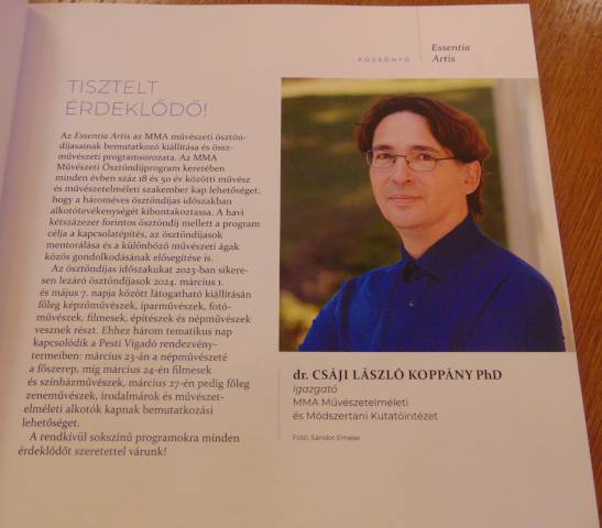 Üdvözlőbeszédet mondott Csáji László Koppány, az MMA Művészetelméleti és Módszertani Kutatóintézet igazgatója, köszöntőt mondott Turi Attila, a Magyar Művészeti Akadémia elnöke. A kiállítást és a programsorozatot Rátóti Zoltán, a Magyar Művészeti Akadémia alelnöke nyitotta meg, közreműködött Török Máté verséneklő előadó-, Balogh Vera fuvola- és Győri István gitárművész. Fotóink Egressy Rita felvételei.