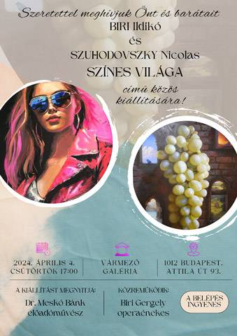 Biri Ildikó és Szuhodovszky Nicolas színes világa című közös kiállítás nyílt ma 17 órakor a Budai várkerületi Attila út 93-ban, a VárMező Galériában.