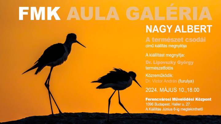 Nagy Albert 75 éves természetfotós: A természet csodái című kiállítása nyílt meg tegnap 18 órakor a Ferencvárosi Művelődési Központ földszintjén. Közreműködött unokabátyja: dr. Victor András furulyás. A június 06-án csütörtökig látható tárlatot dr. Lipovszky György természetfotós nyitotta meg a Haller utca 27-ben.