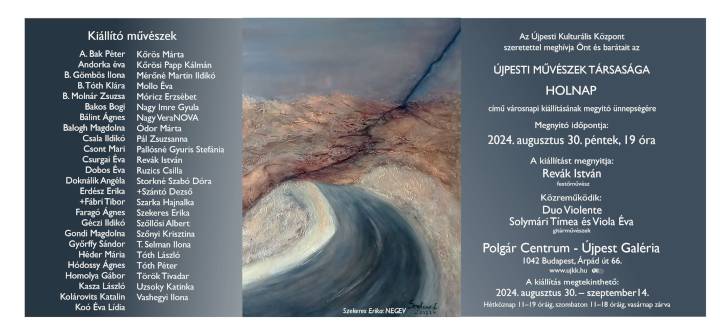 A Polgár Centrum – Újpest Galériában tegnap 19 órakor nyílt meg az Újpesti Művészek Társasága: Holnap című városnapi kiállítása. A 49 művész alkotásai szeptember 14-én szombatig hétköznap 11-től 19 óráig, szombaton 11-től 18 óráig láthatók.