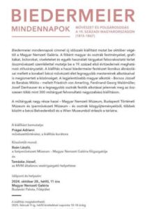 A főként magyar és osztrák festményeket. grafikákat, bútorokat, viseleteket és egyéb használati tárgyakat felsorakoztató tárlat össz-művészeti szemlélettel mutatja be a XIX. század első évtizedének meghatározó stílusirányzatát A kiállítás a hazai biedermeier festészet ikonlkus ábrázolásai mellett a korabeli bécsi művészeti élet legnagyobb mestereinek alkotásaival is megismerteti a közönséget.
