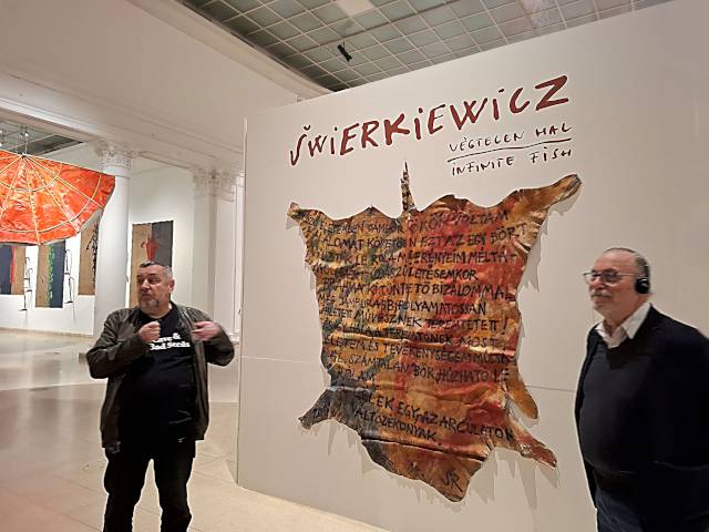 Šwierkiewicz Róbert (1942-2019): Végtelen hal című múlt csütörtökön megnyílt kiállításán Rockenbauer Zoltán PhD művészettörténész, a tárlat kurátora tartott félórás tárlatvezetést, majd fogadta kérdéseinket. Fotósunk itt is Katona Lucia volt. Mindkét tárlat 2025. január 19-ig látható.