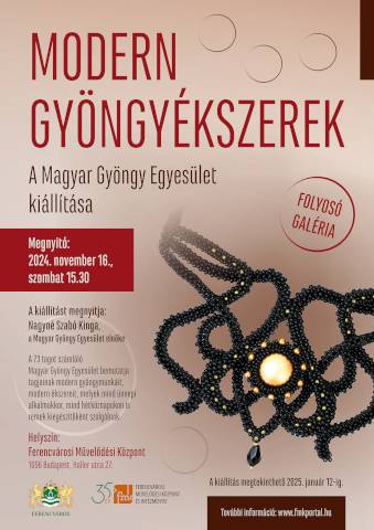 A 75 tagú Magyar Gyöngy Egyesület Modern gyöngyékszerek című kiállítása ma 15:30-kor nyílt meg a Ferencvárosi Művelődési Ház I. emeleti Folyosó Galériáján. A 2025. január 12-én vasárnapig látható tárlatot Nagyné Szabó Kinga gyöngyfűző népi iparművész, az MGYE elnöke nyitotta meg.