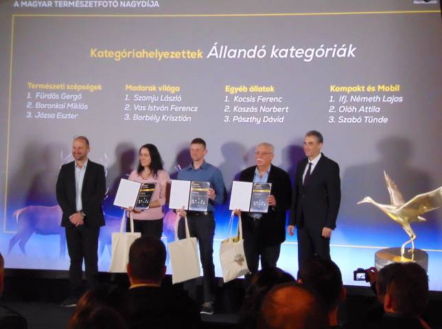 A ranglista 50-4. helyezettjeinek fotóiból készített csodálatos képvetítés után az est legizgalmasabb részéhez érkezve megtudhattuk, kik lettek A magyar természetfotó nagydíjának dobogósai. A nyertesek díjait Esther Horvath, az est kiemelt vendége; Gaál Péter, a VM alapítója és Kövesi Eszter, a VM ügyvezetője adták át. A 3. helyen Kaszás Norbert végzett, aki az Arany Daru szobor bronz változatát kapta meg, a 2. helyezett Daróczi Csaba tavalyi győztes egy ezüst szobrot vett át, a nagydíjat megtestesítő Arany Daru szobrot pedig a 43. szülinapját ünneplő Potyó Imre érdemelte ki, aki a pályázati évadot immár 5. ízben nyerte meg.