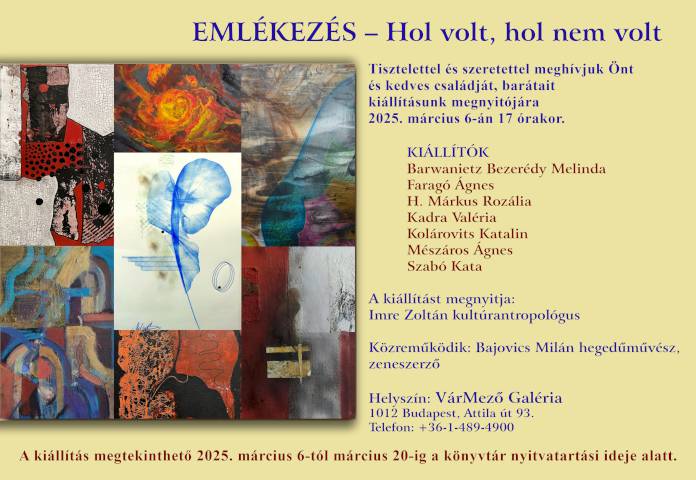 Az Emlékezés – Hol volt, hol nem volt című képzőművészeti kiállítás nyílt ma 17 órakor az MMGMK Mezőgazdasági Könyvtár VárMező Galériájában, a Budapest I. Attila út 93-ban 7 művésznő: Barwanietz Bezerédy Melinda, Faragó Ágnes, H. Márkus Rozália, Kadra Valéria, Kolárovits Katalin, Mészáros Ágnes és a társakat meghívó Szabó Kata munkáiból.