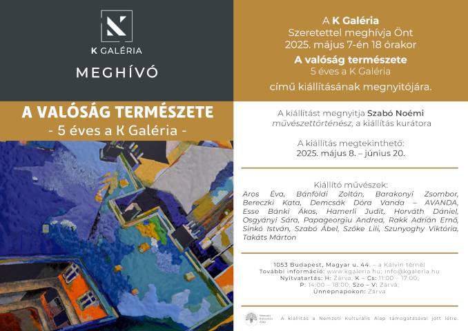 Tegnap 18 órakor nyílt meg A valóság természete – 5 éves a K Galéria című csoportos kiállítás a K Galéria földszintjén és galériáján, a belvárosi Magyar utca 44-ben a Kálvin térnél. A június 20-ai nyári bezárásig látható tárlaton Katona Lucia fényképezett. Az előzmények idekattintva olvashatók.