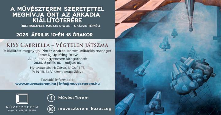 A K Galéria -1. szintjén, az Árkádia Kiállítótérben még április 10-én csütörtökön 18 órakor nyílt meg Kiss Gabriella: Végtelen játszma című egyéni kiállítása a MűvészTeremben, ahol a Művész Terem! A május 16-án péntekig látható tárlatot Pintér Andrea nyitotta meg. A kiállítás a MűvészTerem alkotóközösség keretein belül jött létre, ahol cél lehetőséget adni minden kreatív alkotónak a művészete megmutatására, előképzettségtől függetlenül és egy támogató, inspiráló művészközösséget építeni!