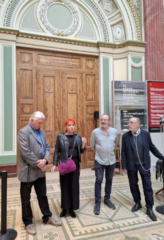 – Visszavettük a kiterjesztett valóságtól ezt a fogalmat, mert a művészet teljes egészére érvényes: a kiállítás hat termében azt szerettük volna hangsúlyozni, hogy minden műalkotás, minden művészeti tárgy egyszeri és megismételhetetlen – jelentette ki a tanácsadónő, majd Baksai József, a kiállítás főkurátora és Verebes György társkurátor bemutatta mind a hat terem tárgyait.
